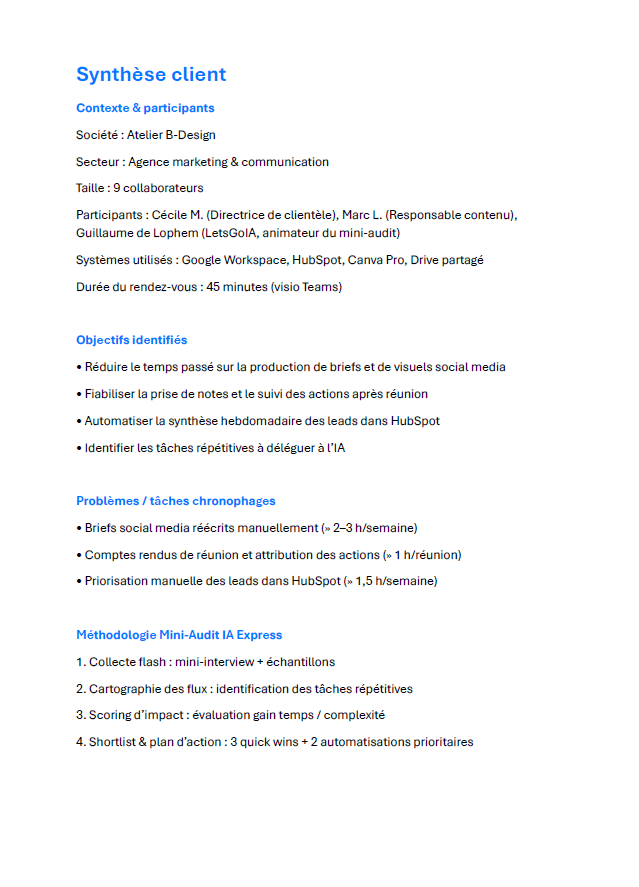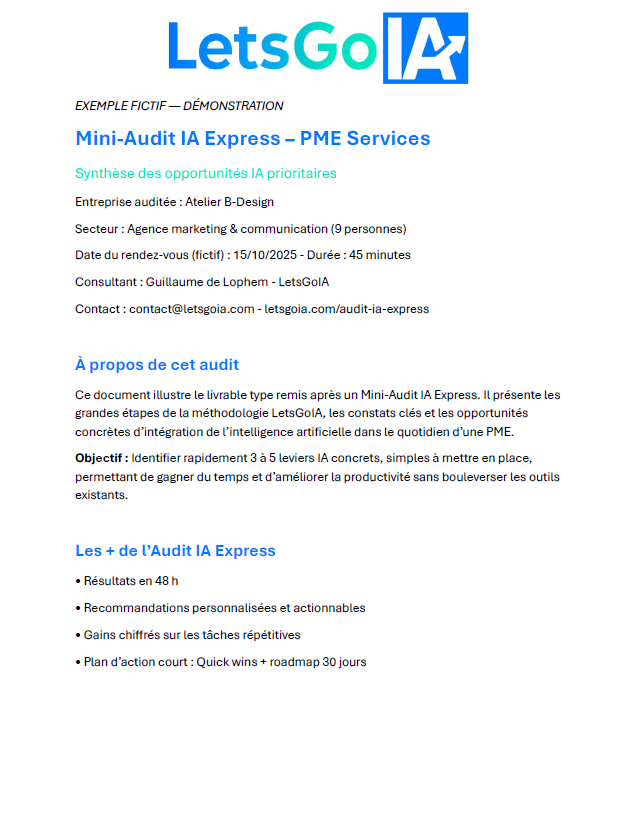 📄 Exemple de livrable : Mini-Audit IA Express – PME Services (aperçu)