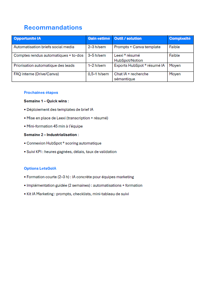 - Synthèse et prochaines étapes (60 min). Vous recevez un mini-audit PDF avec vos recommandations personnalisées et les prochaines étapes possibles (implémentation, formation ou kit IA).