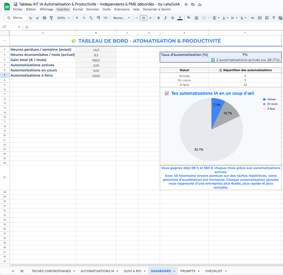 Vous visualisez vos heures perdues, vos gains, vos automatisations actives et votre potentiel complet.